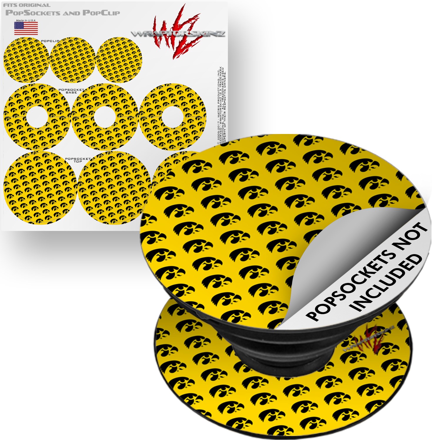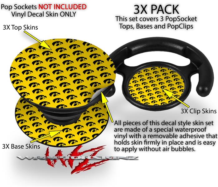 Decal Style Vinyl Skin Wrap 3 Pack for PopSockets Iowa Hawkeyes Tigerhawk Tiled 06 Black on Gold (POPSOCKET NOT INCLUDED)