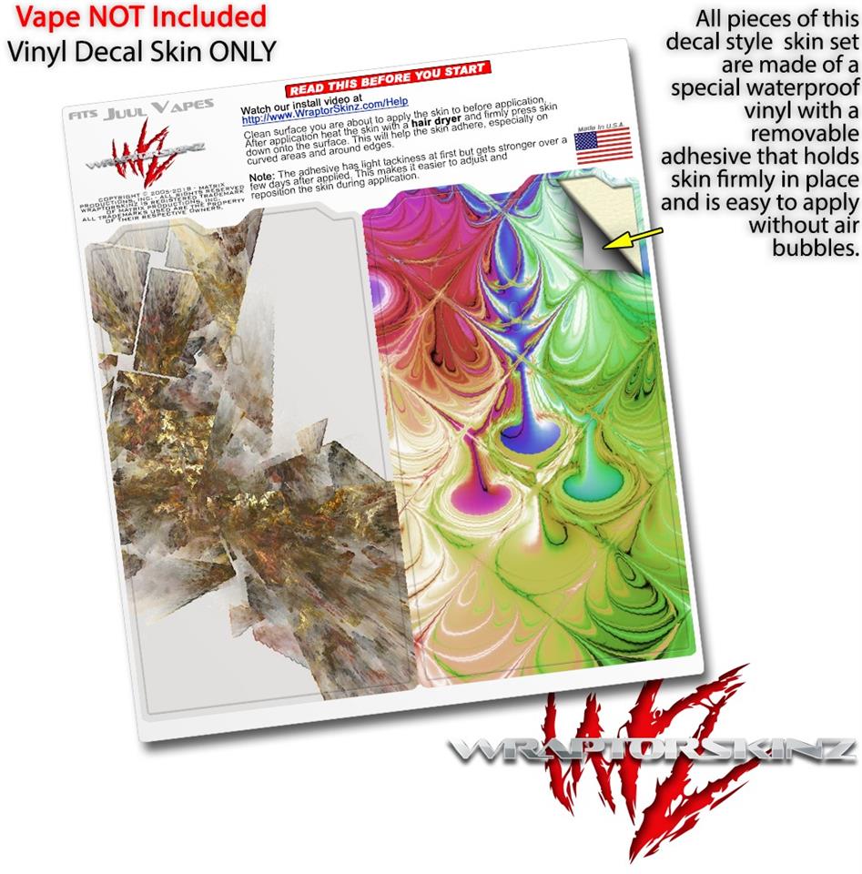 WraptorSkinz® skin wraps are printed using superb photo quality designs and vibrant colors printed with special fade resistant inks that last even in direct sun for years. WraptorSkinz are a composite of two layers of commercial grade materials. The bottom layer is a soft, flexible vinyl with a special removable adhesive that is easily positioned, applied without air bubbles. Next we print the bottom layer with UV protected, fade resistant inks that deliver superb photo quality designs in vibrant colors. Finally we bond a professional grade laminate over the entire skin adding a glossy protective finish. This product is not affiliated with or endorsed by the Juul brand.