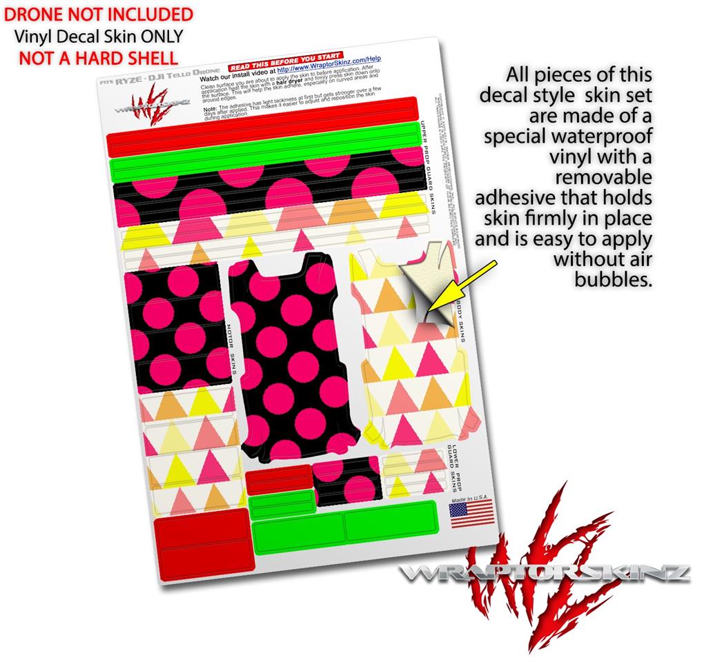 WraptorSkinz® skin wraps are printed using superb photo quality designs and vibrant colors printed with special fade resistant inks that last even in direct sun for years. WraptorSkinz are a composite of two layers of commercial grade materials. The bottom layer is a soft, flexible vinyl with a special removable adhesive that is easily positioned, applied without air bubbles. Next we print the bottom layer with UV protected, fade resistant inks that deliver superb photo quality designs in vibrant colors. Finally we bond a professional grade laminate over the entire skin adding a glossy protective finish. This product is not affiliated with or endorsed by the Ryze or DJI brand.