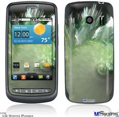 Skin covers front and back of LG Vortex cell phone.