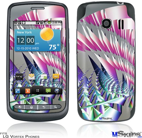 Skin covers front and back of LG Vortex cell phone.
