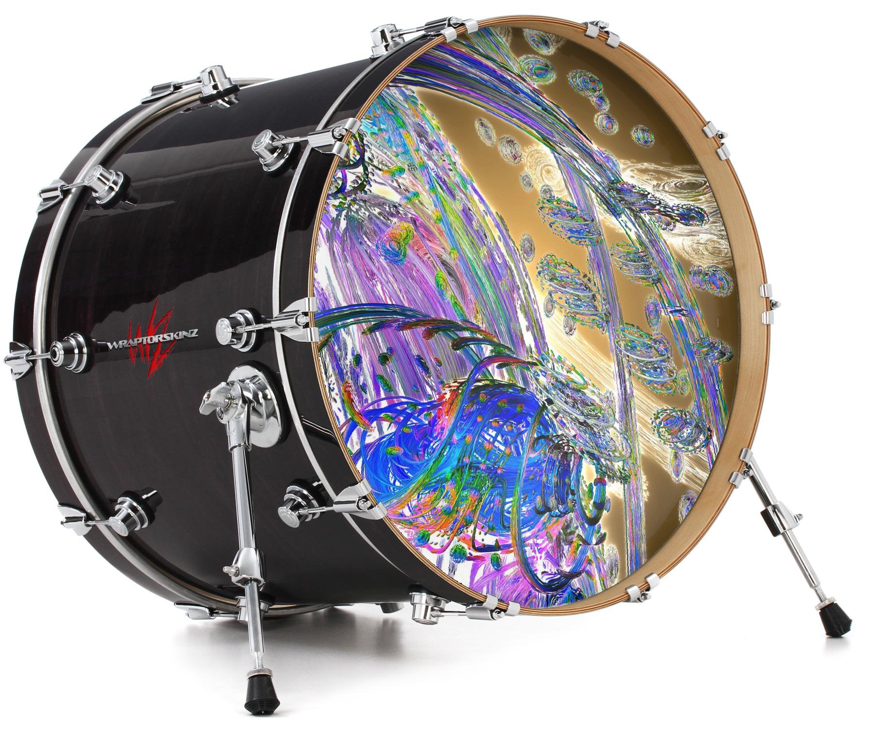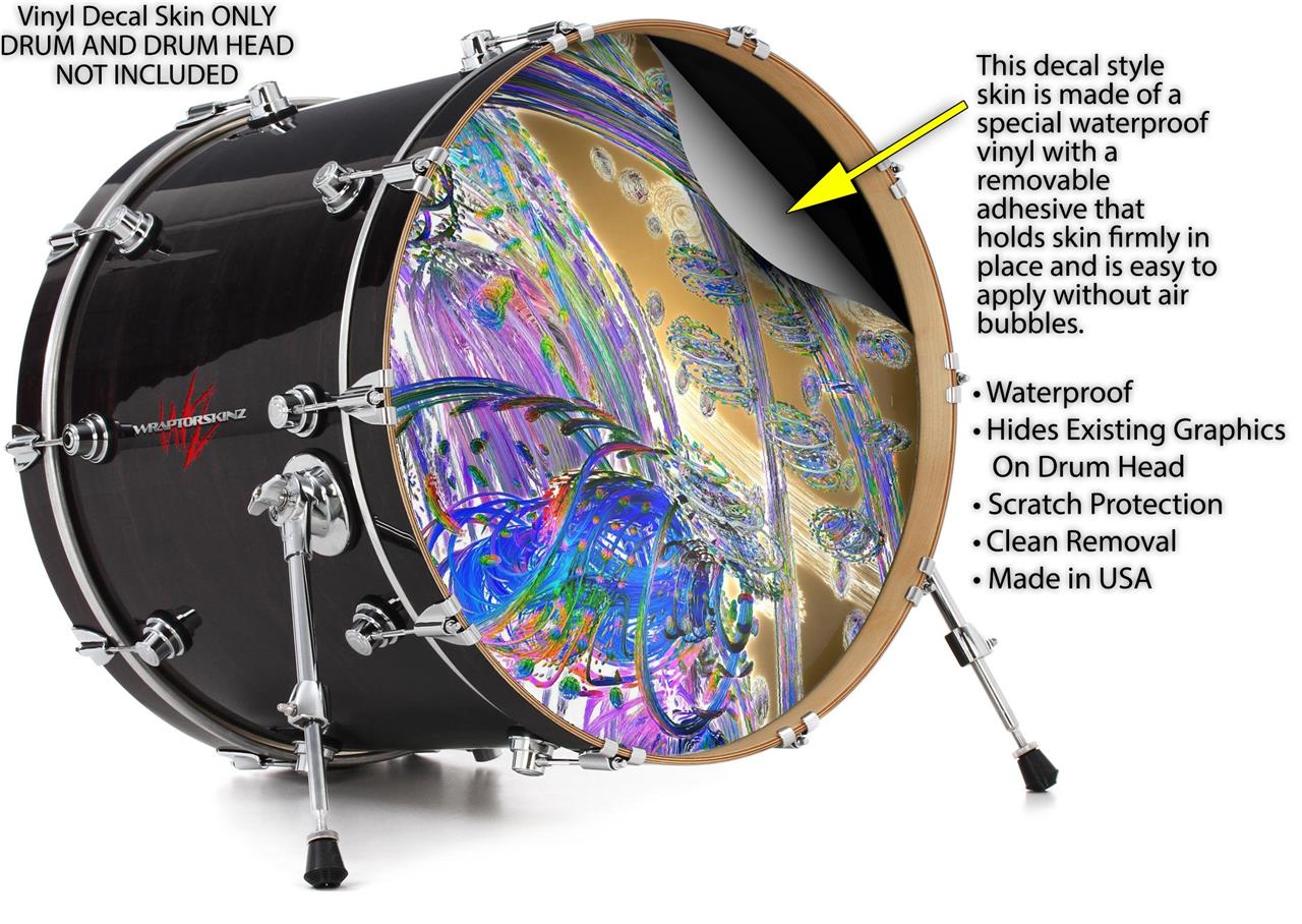 This design also available in other sizes. WraptorSkinz® skin wraps compatible with most kick drum heads. Printed using superb photo quality designs and vibrant colors printed with special fade resistant inks that last even in direct sun for years. WraptorSkinz are a composite three layer commercial grade materials vinyl. The bottom layer is a air release, grey block out removable adhesive that hides existing graphics on the drum head and is easily applied without air bubbles. The middle layer is a flexible vinyl printed with UV protected, fade resistant inks that deliver superb photo quality designs in vibrant colors. Finally, we bond a professional grade laminate over the entire skin adding a glossy protective finish.