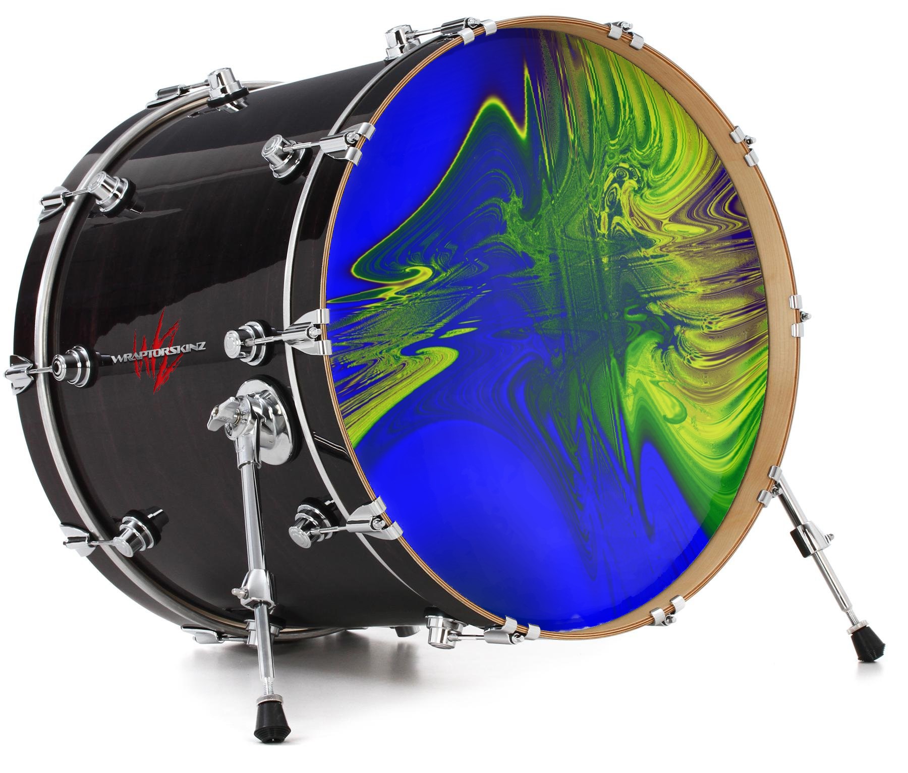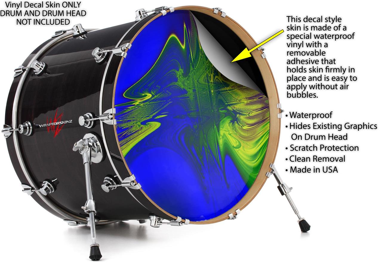 This design also available in other sizes. WraptorSkinz® skin wraps compatible with most kick drum heads. Printed using superb photo quality designs and vibrant colors printed with special fade resistant inks that last even in direct sun for years. WraptorSkinz are a composite three layer commercial grade materials vinyl. The bottom layer is a air release, grey block out removable adhesive that hides existing graphics on the drum head and is easily applied without air bubbles. The middle layer is a flexible vinyl printed with UV protected, fade resistant inks that deliver superb photo quality designs in vibrant colors. Finally, we bond a professional grade laminate over the entire skin adding a glossy protective finish.