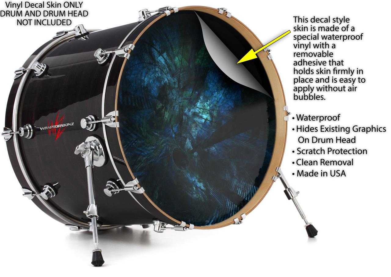 This design also available in other sizes. WraptorSkinz® skin wraps compatible with most kick drum heads. Printed using superb photo quality designs and vibrant colors printed with special fade resistant inks that last even in direct sun for years. WraptorSkinz are a composite three layer commercial grade materials vinyl. The bottom layer is a air release, grey block out removable adhesive that hides existing graphics on the drum head and is easily applied without air bubbles. The middle layer is a flexible vinyl printed with UV protected, fade resistant inks that deliver superb photo quality designs in vibrant colors. Finally, we bond a professional grade laminate over the entire skin adding a glossy protective finish.