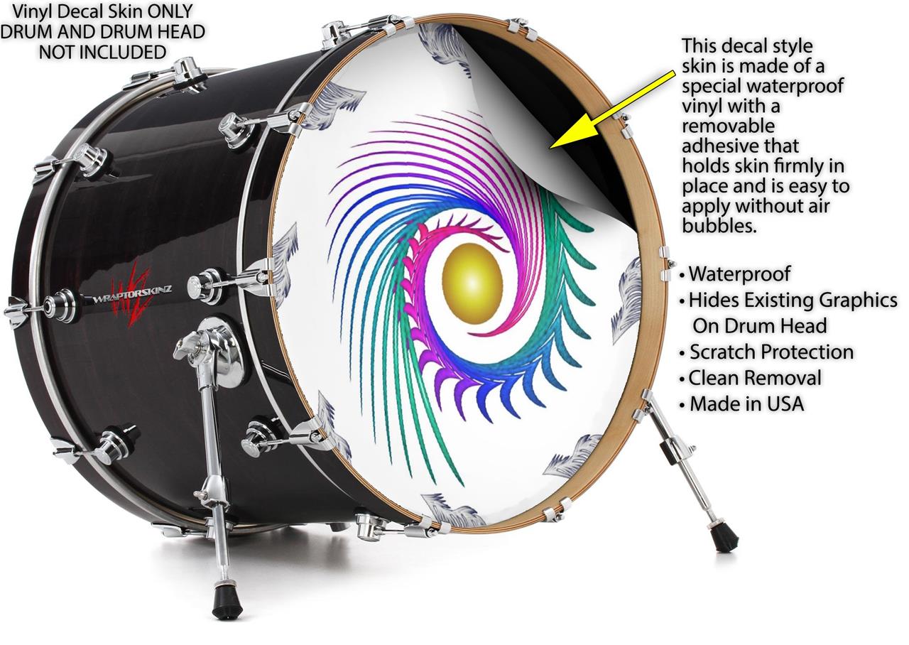 This design also available in other sizes. WraptorSkinz® skin wraps compatible with most kick drum heads. Printed using superb photo quality designs and vibrant colors printed with special fade resistant inks that last even in direct sun for years. WraptorSkinz are a composite three layer commercial grade materials vinyl. The bottom layer is a air release, grey block out removable adhesive that hides existing graphics on the drum head and is easily applied without air bubbles. The middle layer is a flexible vinyl printed with UV protected, fade resistant inks that deliver superb photo quality designs in vibrant colors. Finally, we bond a professional grade laminate over the entire skin adding a glossy protective finish.