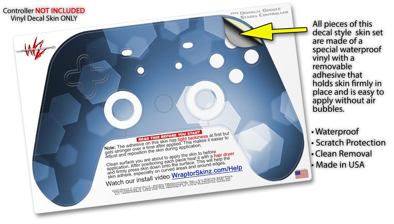 This product is in no way affiliated with or endorsed by Google. WraptorSkinz® skin wraps work with the Original Google Stadia version 1 Controller. Printed using superb photo quality designs and vibrant colors printed with special fade resistant inks that last even in direct sun for years. WraptorSkinz are a composite of two layers of commercial grade materials. The bottom layer is a soft, flexible vinyl with a special removable adhesive that is easily positioned, applied without air bubbles. Next, we print the bottom layer with UV protected, fade resistant inks that deliver superb photo quality designs in vibrant colors. Finally, we bond a professional grade laminate over the entire skin adding a glossy protective finish.