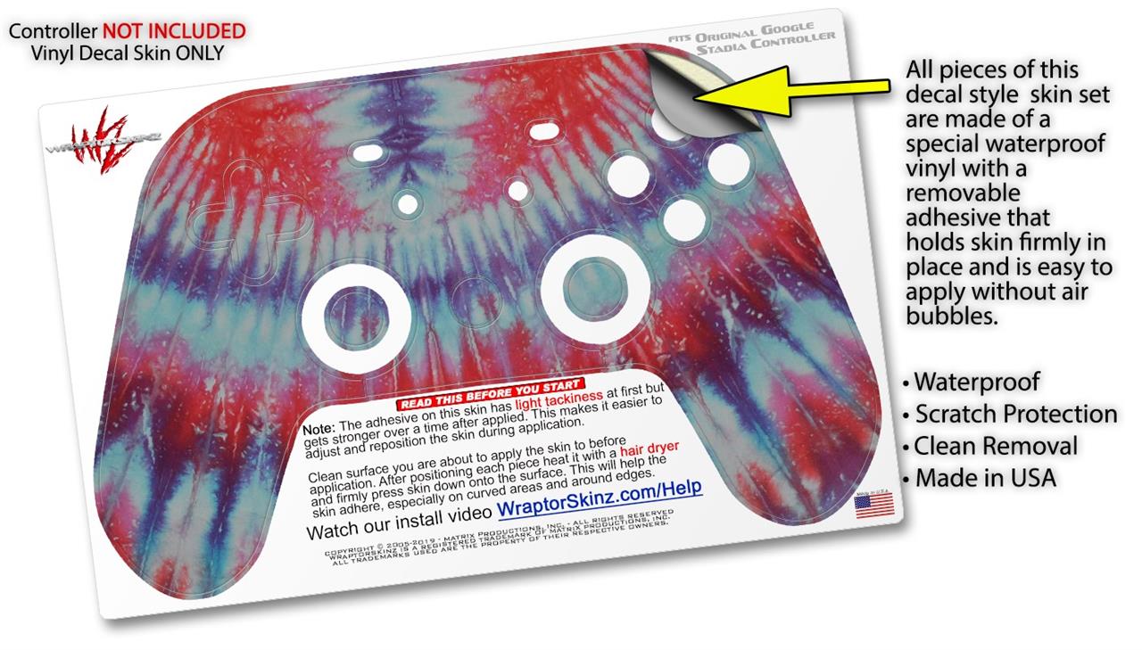 This product is in no way affiliated with or endorsed by Google. WraptorSkinz® skin wraps work with the Original Google Stadia version 1 Controller. Printed using superb photo quality designs and vibrant colors printed with special fade resistant inks that last even in direct sun for years. WraptorSkinz are a composite of two layers of commercial grade materials. The bottom layer is a soft, flexible vinyl with a special removable adhesive that is easily positioned, applied without air bubbles. Next, we print the bottom layer with UV protected, fade resistant inks that deliver superb photo quality designs in vibrant colors. Finally, we bond a professional grade laminate over the entire skin adding a glossy protective finish.