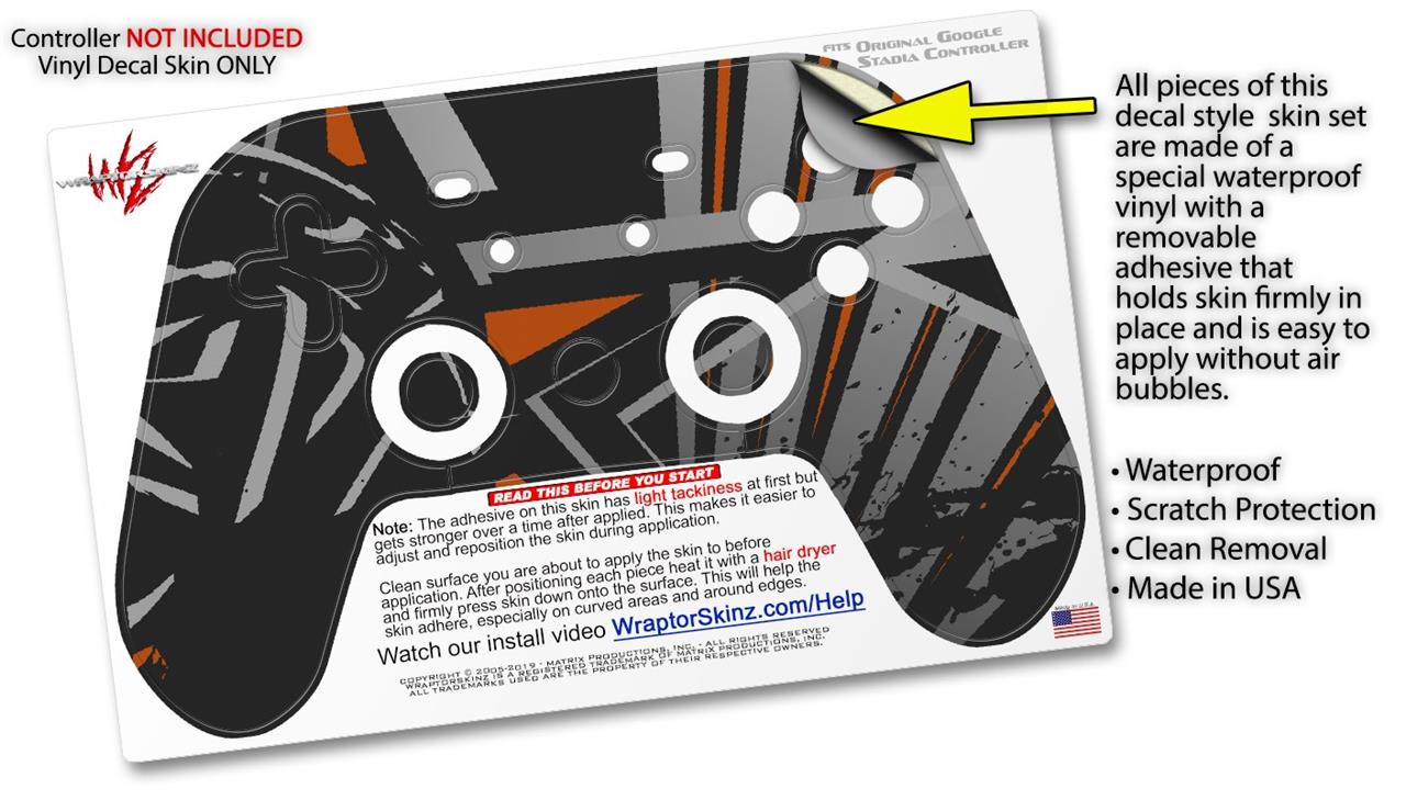 This product is in no way affiliated with or endorsed by Google. WraptorSkinz® skin wraps work with the Original Google Stadia version 1 Controller. Printed using superb photo quality designs and vibrant colors printed with special fade resistant inks that last even in direct sun for years. WraptorSkinz are a composite of two layers of commercial grade materials. The bottom layer is a soft, flexible vinyl with a special removable adhesive that is easily positioned, applied without air bubbles. Next, we print the bottom layer with UV protected, fade resistant inks that deliver superb photo quality designs in vibrant colors. Finally, we bond a professional grade laminate over the entire skin adding a glossy protective finish.