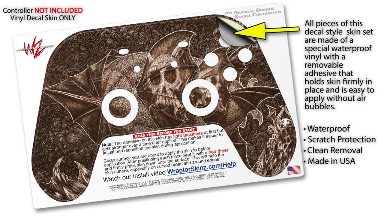 This product is in no way affiliated with or endorsed by Google. WraptorSkinz® skin wraps work with the Original Google Stadia version 1 Controller. Printed using superb photo quality designs and vibrant colors printed with special fade resistant inks that last even in direct sun for years. WraptorSkinz are a composite of two layers of commercial grade materials. The bottom layer is a soft, flexible vinyl with a special removable adhesive that is easily positioned, applied without air bubbles. Next, we print the bottom layer with UV protected, fade resistant inks that deliver superb photo quality designs in vibrant colors. Finally, we bond a professional grade laminate over the entire skin adding a glossy protective finish.