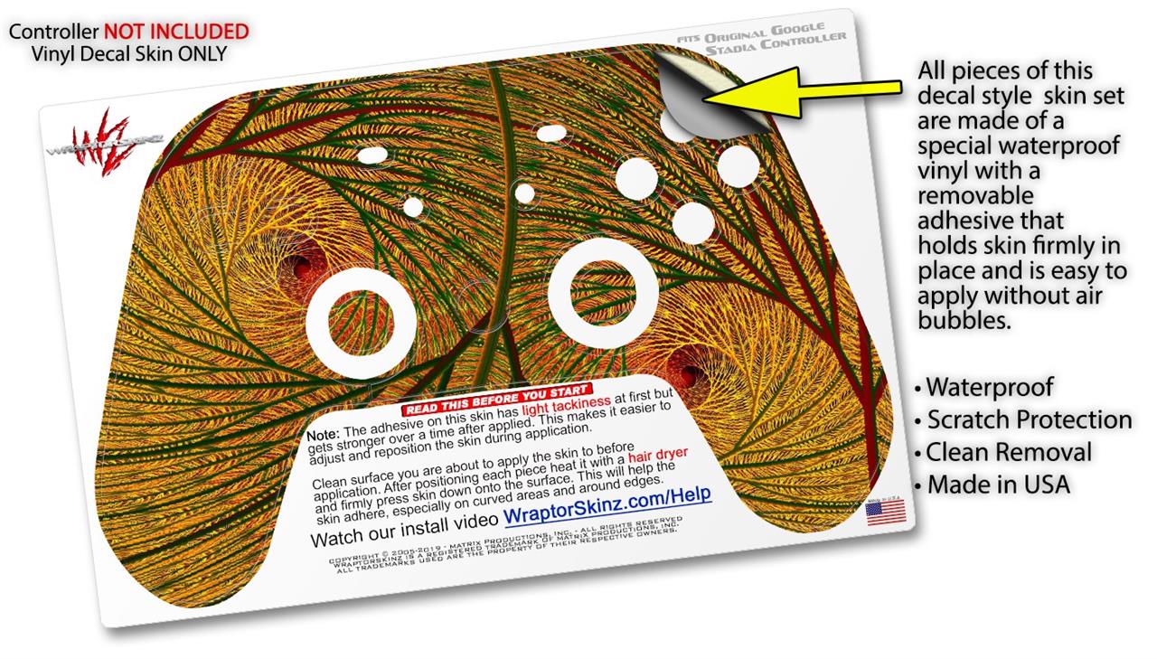 This product is in no way affiliated with or endorsed by Google. WraptorSkinz® skin wraps work with the Original Google Stadia version 1 Controller. Printed using superb photo quality designs and vibrant colors printed with special fade resistant inks that last even in direct sun for years. WraptorSkinz are a composite of two layers of commercial grade materials. The bottom layer is a soft, flexible vinyl with a special removable adhesive that is easily positioned, applied without air bubbles. Next, we print the bottom layer with UV protected, fade resistant inks that deliver superb photo quality designs in vibrant colors. Finally, we bond a professional grade laminate over the entire skin adding a glossy protective finish.