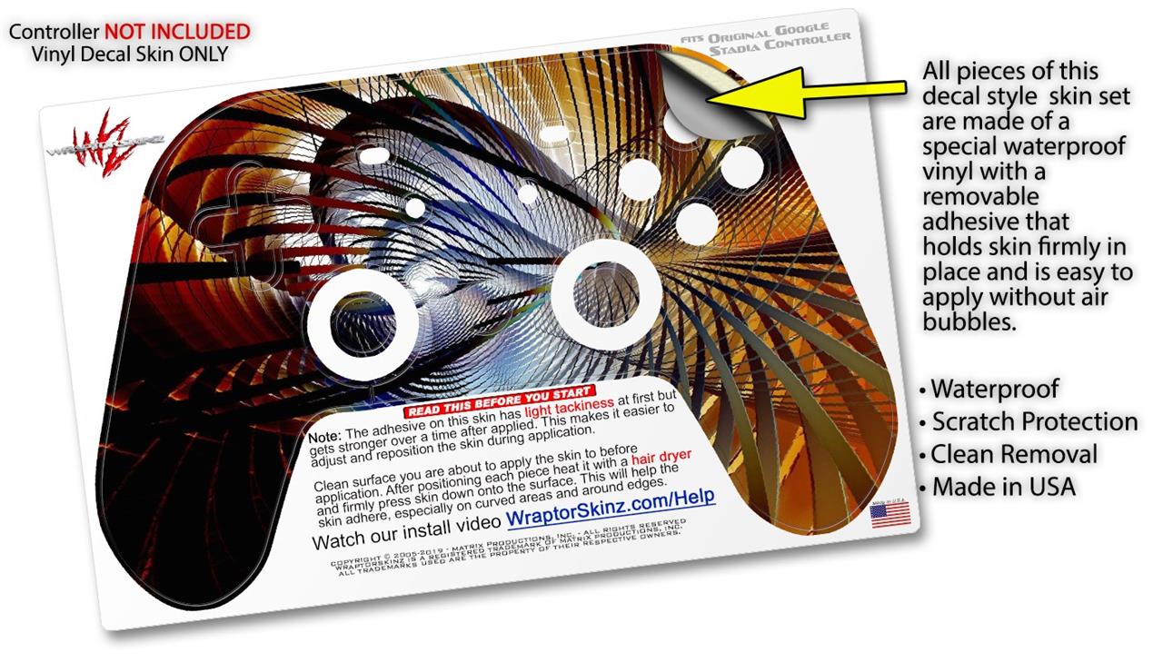 This product is in no way affiliated with or endorsed by Google. WraptorSkinz® skin wraps work with the Original Google Stadia version 1 Controller. Printed using superb photo quality designs and vibrant colors printed with special fade resistant inks that last even in direct sun for years. WraptorSkinz are a composite of two layers of commercial grade materials. The bottom layer is a soft, flexible vinyl with a special removable adhesive that is easily positioned, applied without air bubbles. Next, we print the bottom layer with UV protected, fade resistant inks that deliver superb photo quality designs in vibrant colors. Finally, we bond a professional grade laminate over the entire skin adding a glossy protective finish.