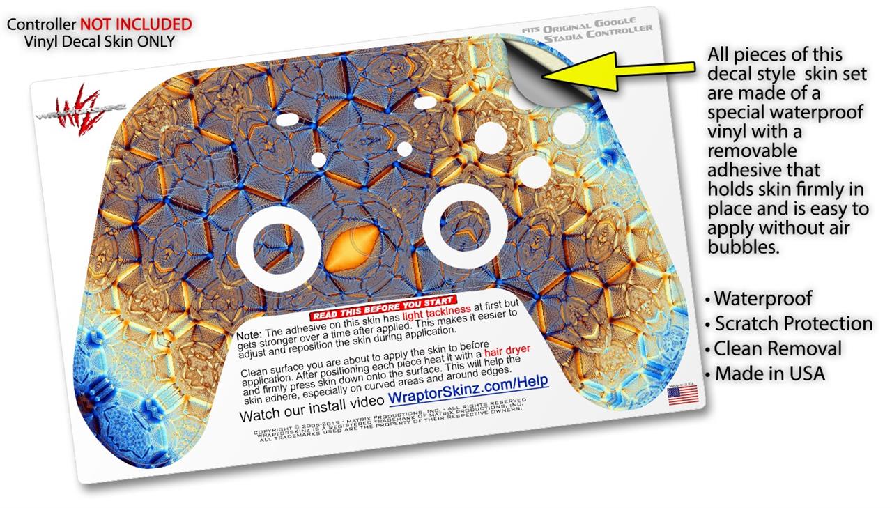 This product is in no way affiliated with or endorsed by Google. WraptorSkinz® skin wraps work with the Original Google Stadia version 1 Controller. Printed using superb photo quality designs and vibrant colors printed with special fade resistant inks that last even in direct sun for years. WraptorSkinz are a composite of two layers of commercial grade materials. The bottom layer is a soft, flexible vinyl with a special removable adhesive that is easily positioned, applied without air bubbles. Next, we print the bottom layer with UV protected, fade resistant inks that deliver superb photo quality designs in vibrant colors. Finally, we bond a professional grade laminate over the entire skin adding a glossy protective finish.