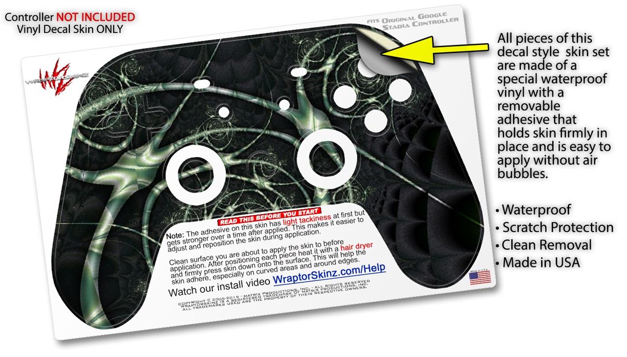 This product is in no way affiliated with or endorsed by Google. WraptorSkinz® skin wraps work with the Original Google Stadia version 1 Controller. Printed using superb photo quality designs and vibrant colors printed with special fade resistant inks that last even in direct sun for years. WraptorSkinz are a composite of two layers of commercial grade materials. The bottom layer is a soft, flexible vinyl with a special removable adhesive that is easily positioned, applied without air bubbles. Next, we print the bottom layer with UV protected, fade resistant inks that deliver superb photo quality designs in vibrant colors. Finally, we bond a professional grade laminate over the entire skin adding a glossy protective finish.