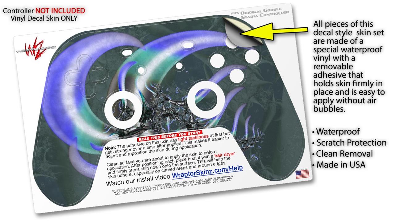 This product is in no way affiliated with or endorsed by Google. WraptorSkinz® skin wraps work with the Original Google Stadia version 1 Controller. Printed using superb photo quality designs and vibrant colors printed with special fade resistant inks that last even in direct sun for years. WraptorSkinz are a composite of two layers of commercial grade materials. The bottom layer is a soft, flexible vinyl with a special removable adhesive that is easily positioned, applied without air bubbles. Next, we print the bottom layer with UV protected, fade resistant inks that deliver superb photo quality designs in vibrant colors. Finally, we bond a professional grade laminate over the entire skin adding a glossy protective finish.