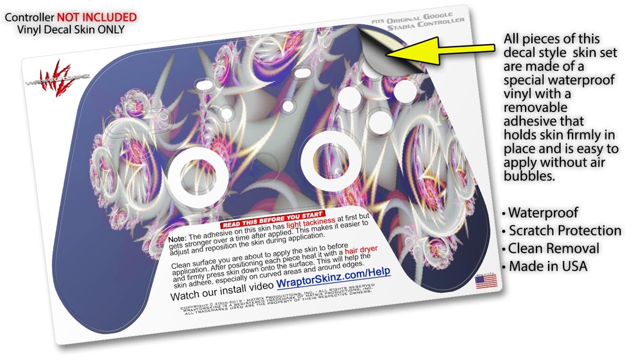 This product is in no way affiliated with or endorsed by Google. WraptorSkinz® skin wraps work with the Original Google Stadia version 1 Controller. Printed using superb photo quality designs and vibrant colors printed with special fade resistant inks that last even in direct sun for years. WraptorSkinz are a composite of two layers of commercial grade materials. The bottom layer is a soft, flexible vinyl with a special removable adhesive that is easily positioned, applied without air bubbles. Next, we print the bottom layer with UV protected, fade resistant inks that deliver superb photo quality designs in vibrant colors. Finally, we bond a professional grade laminate over the entire skin adding a glossy protective finish.