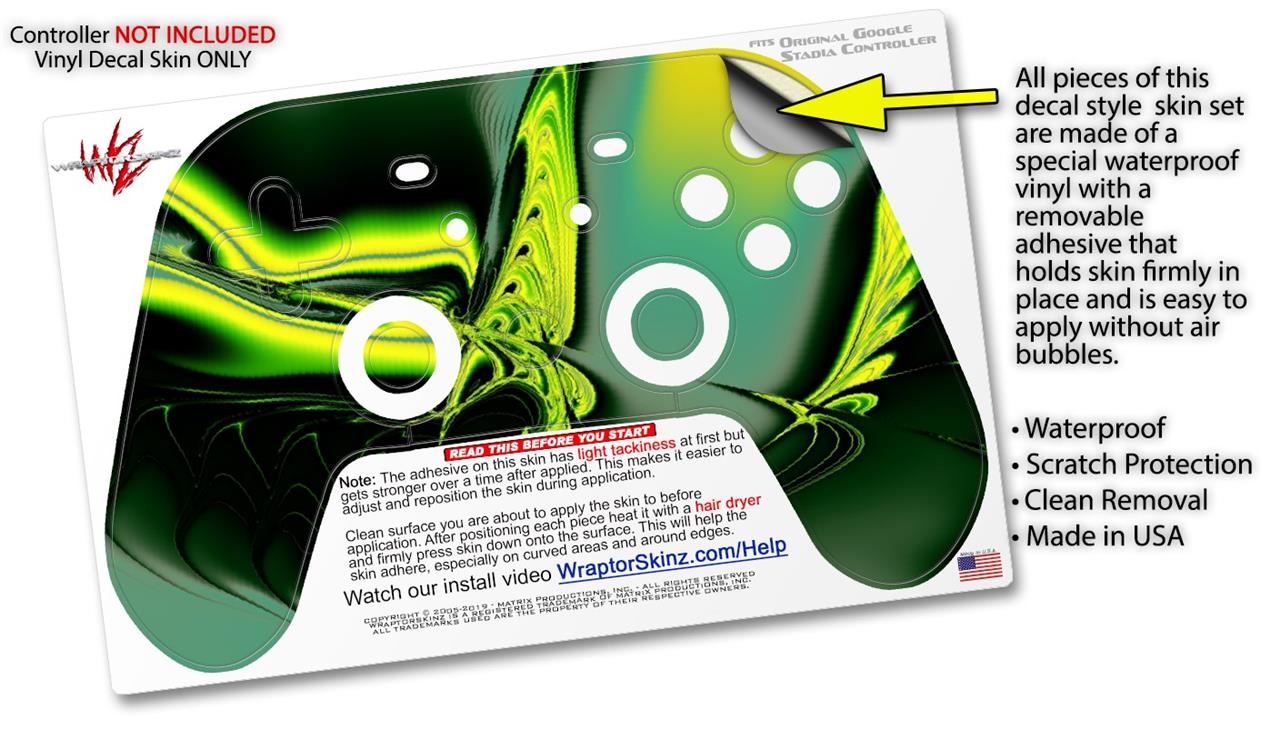 This product is in no way affiliated with or endorsed by Google. WraptorSkinz® skin wraps work with the Original Google Stadia version 1 Controller. Printed using superb photo quality designs and vibrant colors printed with special fade resistant inks that last even in direct sun for years. WraptorSkinz are a composite of two layers of commercial grade materials. The bottom layer is a soft, flexible vinyl with a special removable adhesive that is easily positioned, applied without air bubbles. Next, we print the bottom layer with UV protected, fade resistant inks that deliver superb photo quality designs in vibrant colors. Finally, we bond a professional grade laminate over the entire skin adding a glossy protective finish.