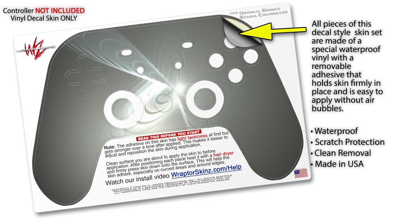 This product is in no way affiliated with or endorsed by Google. WraptorSkinz® skin wraps work with the Original Google Stadia version 1 Controller. Printed using superb photo quality designs and vibrant colors printed with special fade resistant inks that last even in direct sun for years. WraptorSkinz are a composite of two layers of commercial grade materials. The bottom layer is a soft, flexible vinyl with a special removable adhesive that is easily positioned, applied without air bubbles. Next, we print the bottom layer with UV protected, fade resistant inks that deliver superb photo quality designs in vibrant colors. Finally, we bond a professional grade laminate over the entire skin adding a glossy protective finish.