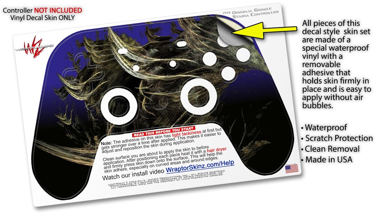 This product is in no way affiliated with or endorsed by Google. WraptorSkinz® skin wraps work with the Original Google Stadia version 1 Controller. Printed using superb photo quality designs and vibrant colors printed with special fade resistant inks that last even in direct sun for years. WraptorSkinz are a composite of two layers of commercial grade materials. The bottom layer is a soft, flexible vinyl with a special removable adhesive that is easily positioned, applied without air bubbles. Next, we print the bottom layer with UV protected, fade resistant inks that deliver superb photo quality designs in vibrant colors. Finally, we bond a professional grade laminate over the entire skin adding a glossy protective finish.