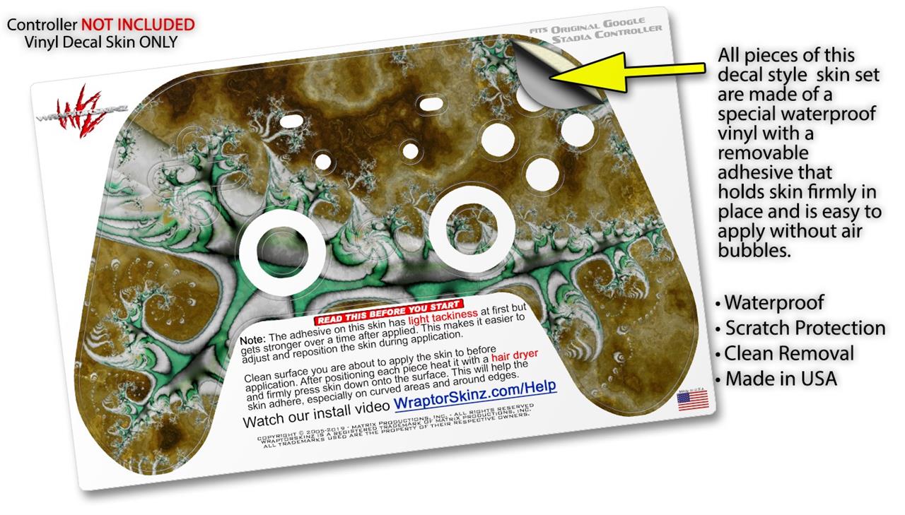 This product is in no way affiliated with or endorsed by Google. WraptorSkinz® skin wraps work with the Original Google Stadia version 1 Controller. Printed using superb photo quality designs and vibrant colors printed with special fade resistant inks that last even in direct sun for years. WraptorSkinz are a composite of two layers of commercial grade materials. The bottom layer is a soft, flexible vinyl with a special removable adhesive that is easily positioned, applied without air bubbles. Next, we print the bottom layer with UV protected, fade resistant inks that deliver superb photo quality designs in vibrant colors. Finally, we bond a professional grade laminate over the entire skin adding a glossy protective finish.