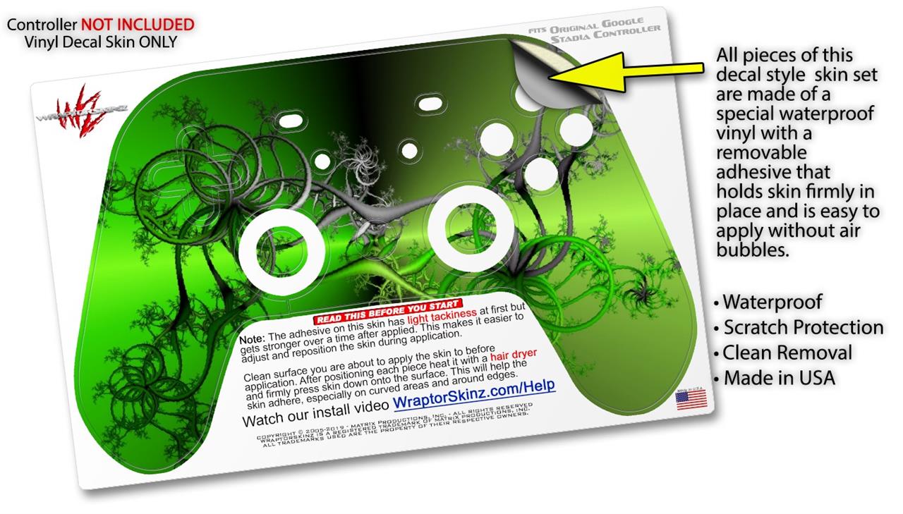 This product is in no way affiliated with or endorsed by Google. WraptorSkinz® skin wraps work with the Original Google Stadia version 1 Controller. Printed using superb photo quality designs and vibrant colors printed with special fade resistant inks that last even in direct sun for years. WraptorSkinz are a composite of two layers of commercial grade materials. The bottom layer is a soft, flexible vinyl with a special removable adhesive that is easily positioned, applied without air bubbles. Next, we print the bottom layer with UV protected, fade resistant inks that deliver superb photo quality designs in vibrant colors. Finally, we bond a professional grade laminate over the entire skin adding a glossy protective finish.