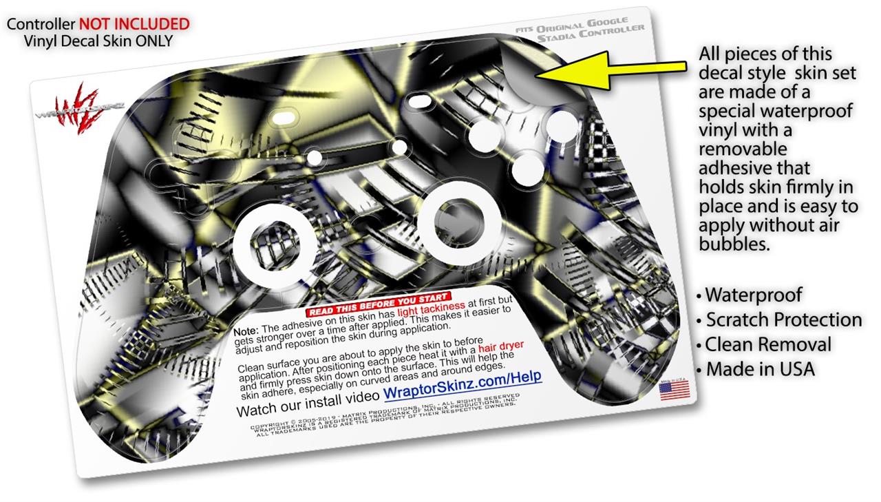 This product is in no way affiliated with or endorsed by Google. WraptorSkinz® skin wraps work with the Original Google Stadia version 1 Controller. Printed using superb photo quality designs and vibrant colors printed with special fade resistant inks that last even in direct sun for years. WraptorSkinz are a composite of two layers of commercial grade materials. The bottom layer is a soft, flexible vinyl with a special removable adhesive that is easily positioned, applied without air bubbles. Next, we print the bottom layer with UV protected, fade resistant inks that deliver superb photo quality designs in vibrant colors. Finally, we bond a professional grade laminate over the entire skin adding a glossy protective finish.