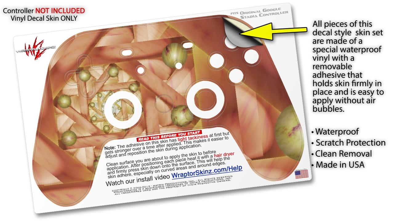 This product is in no way affiliated with or endorsed by Google. WraptorSkinz® skin wraps work with the Original Google Stadia version 1 Controller. Printed using superb photo quality designs and vibrant colors printed with special fade resistant inks that last even in direct sun for years. WraptorSkinz are a composite of two layers of commercial grade materials. The bottom layer is a soft, flexible vinyl with a special removable adhesive that is easily positioned, applied without air bubbles. Next, we print the bottom layer with UV protected, fade resistant inks that deliver superb photo quality designs in vibrant colors. Finally, we bond a professional grade laminate over the entire skin adding a glossy protective finish.