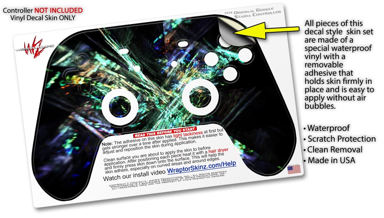 This product is in no way affiliated with or endorsed by Google. WraptorSkinz® skin wraps work with the Original Google Stadia version 1 Controller. Printed using superb photo quality designs and vibrant colors printed with special fade resistant inks that last even in direct sun for years. WraptorSkinz are a composite of two layers of commercial grade materials. The bottom layer is a soft, flexible vinyl with a special removable adhesive that is easily positioned, applied without air bubbles. Next, we print the bottom layer with UV protected, fade resistant inks that deliver superb photo quality designs in vibrant colors. Finally, we bond a professional grade laminate over the entire skin adding a glossy protective finish.