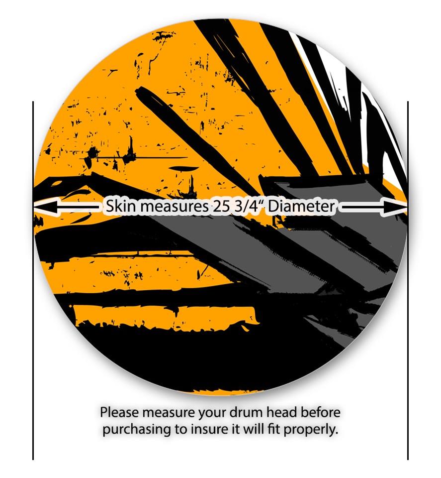 This design also available in other sizes. WraptorSkinz® skin wraps compatible with most kick drum heads. Printed using superb photo quality designs and vibrant colors printed with special fade resistant inks that last even in direct sun for years. WraptorSkinz are a composite three layer commercial grade materials vinyl. The bottom layer is a air release, grey block out removable adhesive that hides existing graphics on the drum head and is easily applied without air bubbles. The middle layer is a flexible vinyl printed with UV protected, fade resistant inks that deliver superb photo quality designs in vibrant colors. Finally, we bond a professional grade laminate over the entire skin adding a glossy protective finish.
