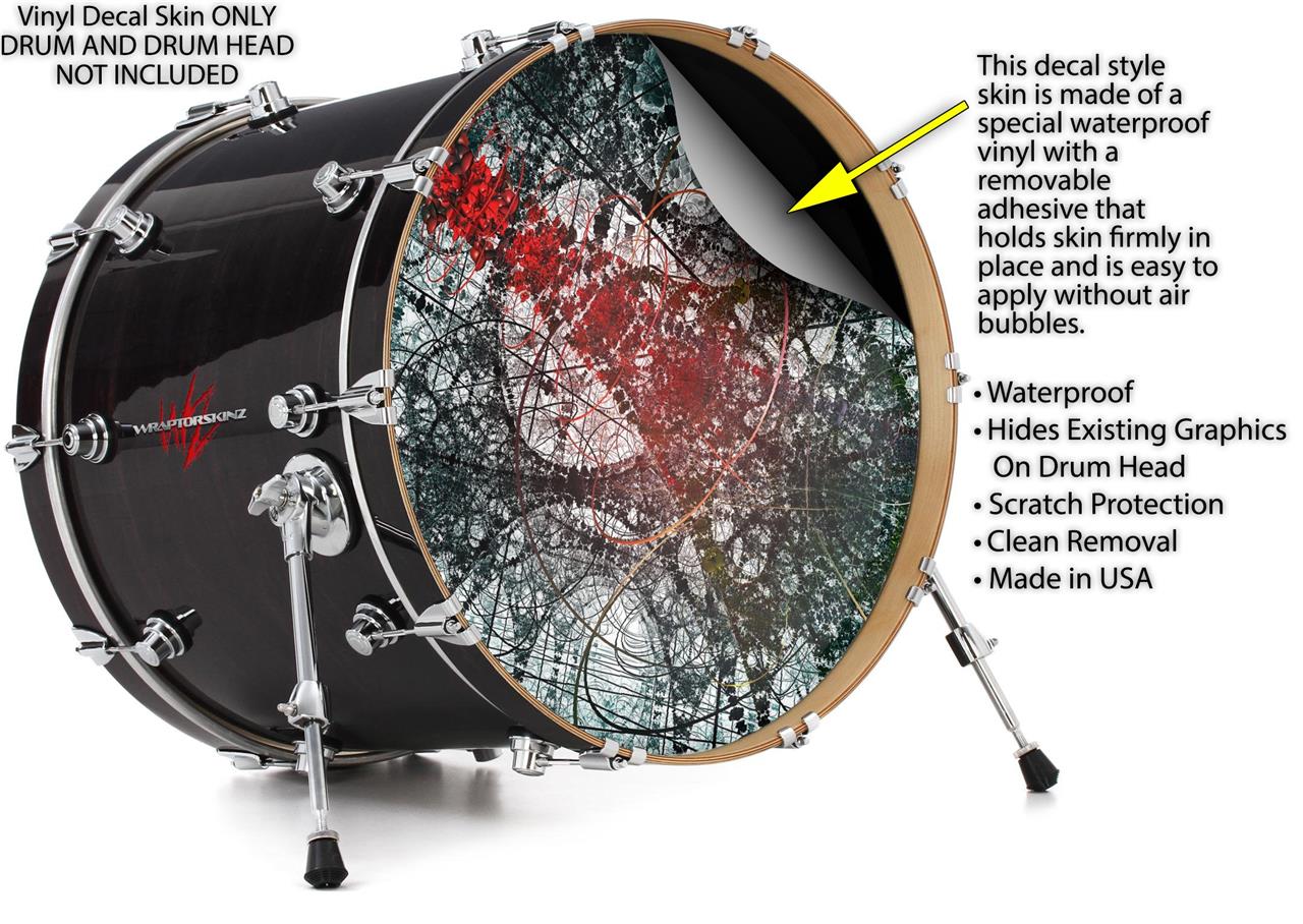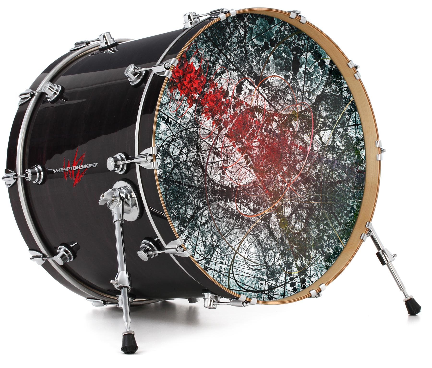 This design also available in other sizes. WraptorSkinz® skin wraps compatible with most kick drum heads. Printed using superb photo quality designs and vibrant colors printed with special fade resistant inks that last even in direct sun for years. WraptorSkinz are a composite three layer commercial grade materials vinyl. The bottom layer is a air release, grey block out removable adhesive that hides existing graphics on the drum head and is easily applied without air bubbles. The middle layer is a flexible vinyl printed with UV protected, fade resistant inks that deliver superb photo quality designs in vibrant colors. Finally, we bond a professional grade laminate over the entire skin adding a glossy protective finish.