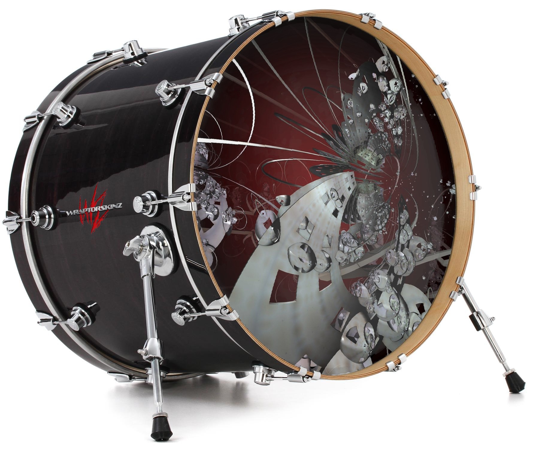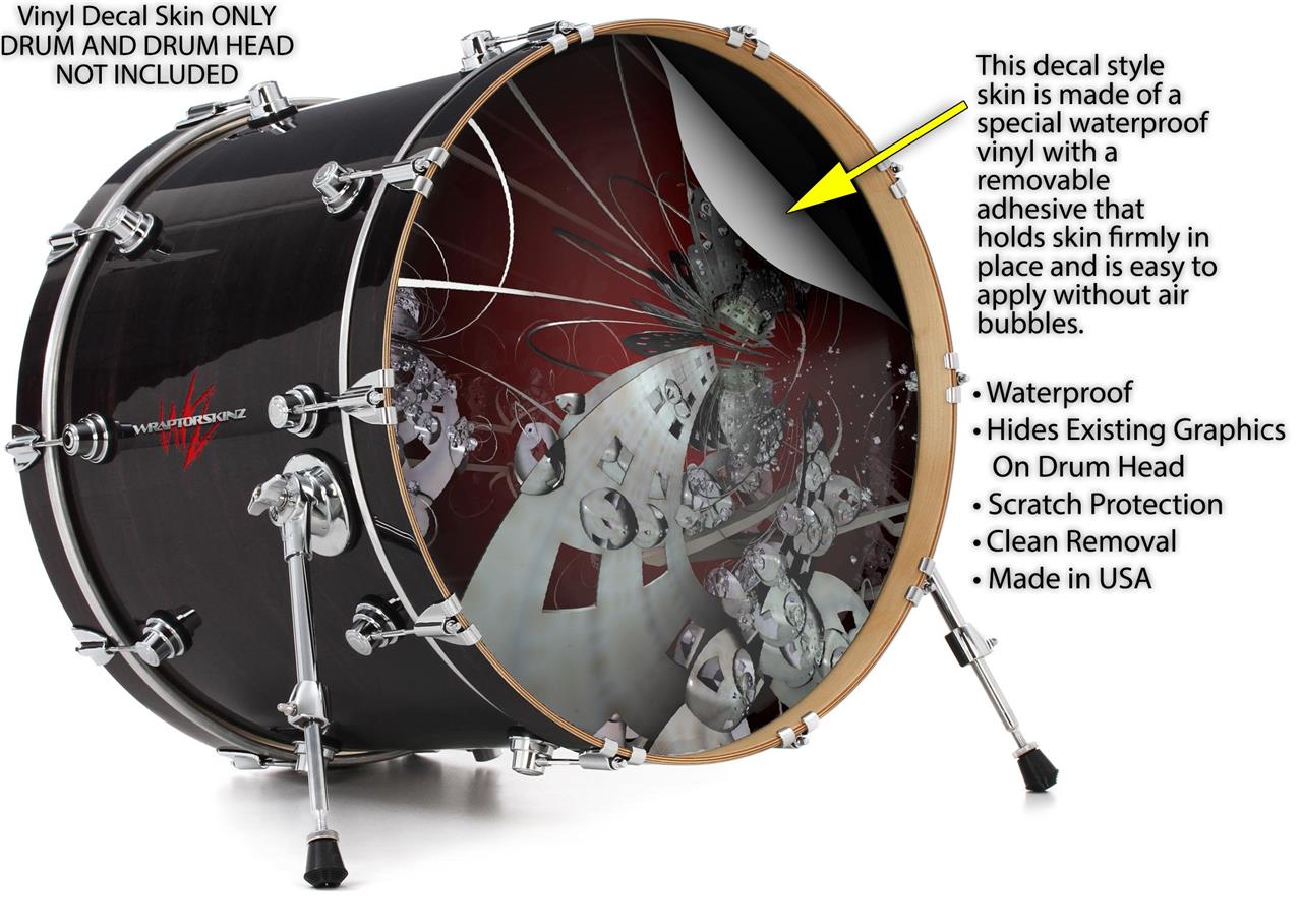 This design also available in other sizes. WraptorSkinz® skin wraps compatible with most kick drum heads. Printed using superb photo quality designs and vibrant colors printed with special fade resistant inks that last even in direct sun for years. WraptorSkinz are a composite three layer commercial grade materials vinyl. The bottom layer is a air release, grey block out removable adhesive that hides existing graphics on the drum head and is easily applied without air bubbles. The middle layer is a flexible vinyl printed with UV protected, fade resistant inks that deliver superb photo quality designs in vibrant colors. Finally, we bond a professional grade laminate over the entire skin adding a glossy protective finish.