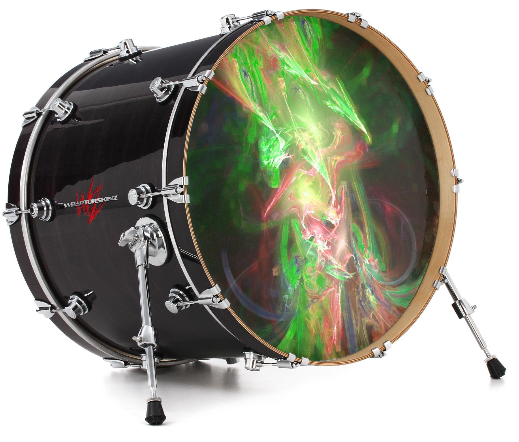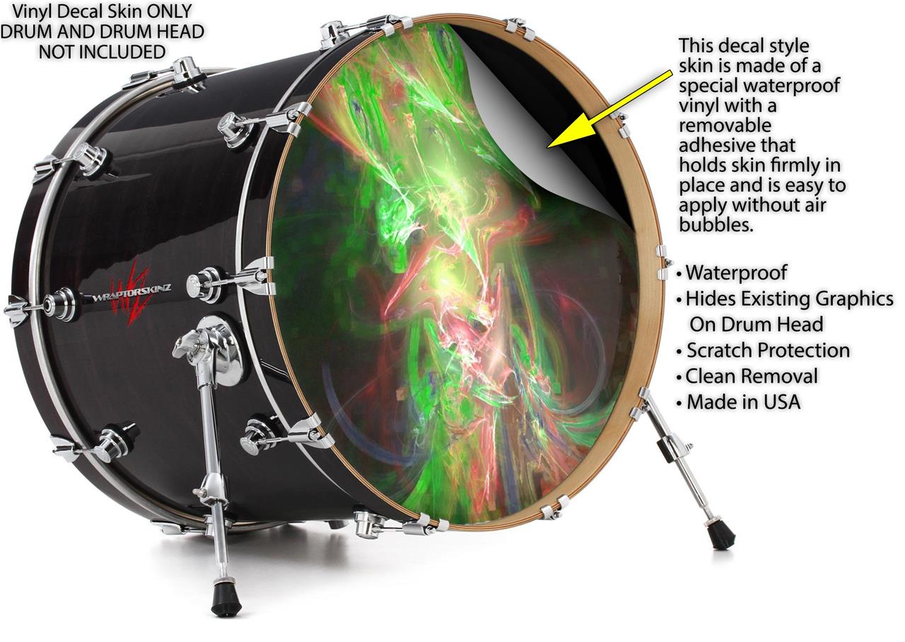 This design also available in other sizes. WraptorSkinz® skin wraps compatible with most kick drum heads. Printed using superb photo quality designs and vibrant colors printed with special fade resistant inks that last even in direct sun for years. WraptorSkinz are a composite three layer commercial grade materials vinyl. The bottom layer is a air release, grey block out removable adhesive that hides existing graphics on the drum head and is easily applied without air bubbles. The middle layer is a flexible vinyl printed with UV protected, fade resistant inks that deliver superb photo quality designs in vibrant colors. Finally, we bond a professional grade laminate over the entire skin adding a glossy protective finish.