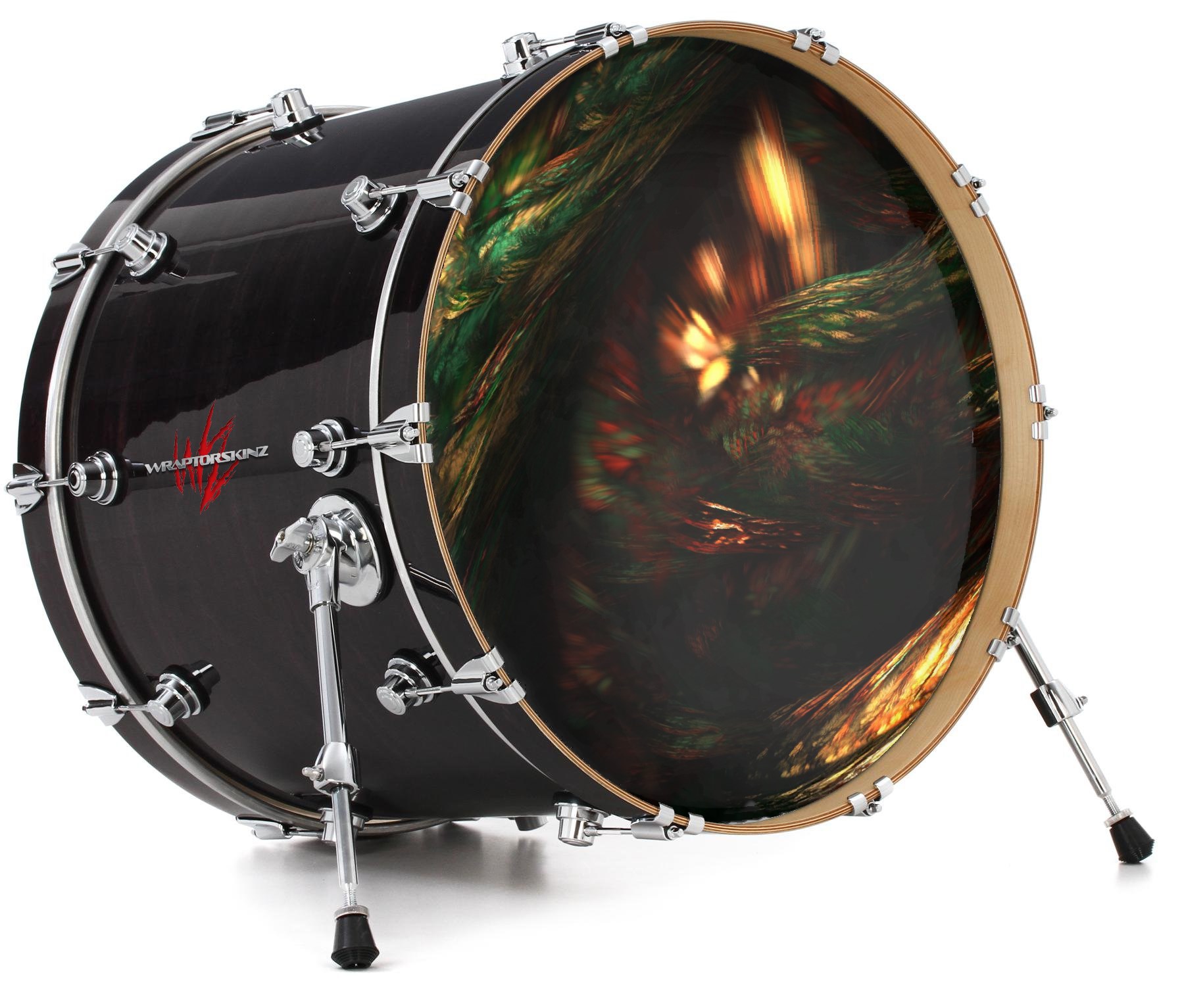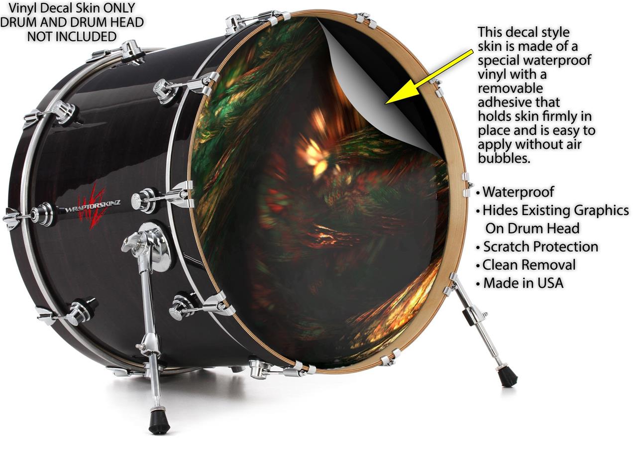 This design also available in other sizes. WraptorSkinz® skin wraps compatible with most kick drum heads. Printed using superb photo quality designs and vibrant colors printed with special fade resistant inks that last even in direct sun for years. WraptorSkinz are a composite three layer commercial grade materials vinyl. The bottom layer is a air release, grey block out removable adhesive that hides existing graphics on the drum head and is easily applied without air bubbles. The middle layer is a flexible vinyl printed with UV protected, fade resistant inks that deliver superb photo quality designs in vibrant colors. Finally, we bond a professional grade laminate over the entire skin adding a glossy protective finish.