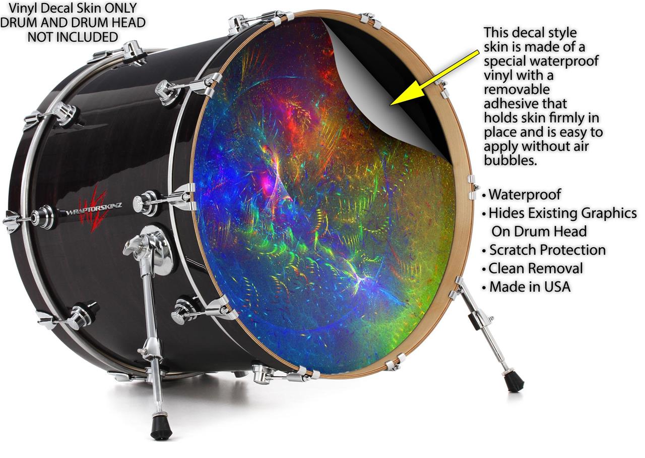 This design also available in other sizes. WraptorSkinz® skin wraps compatible with most kick drum heads. Printed using superb photo quality designs and vibrant colors printed with special fade resistant inks that last even in direct sun for years. WraptorSkinz are a composite three layer commercial grade materials vinyl. The bottom layer is a air release, grey block out removable adhesive that hides existing graphics on the drum head and is easily applied without air bubbles. The middle layer is a flexible vinyl printed with UV protected, fade resistant inks that deliver superb photo quality designs in vibrant colors. Finally, we bond a professional grade laminate over the entire skin adding a glossy protective finish.