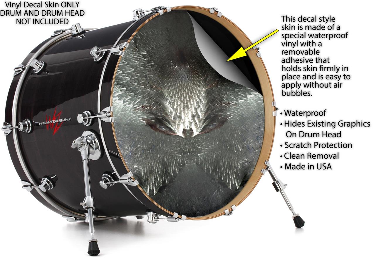 This design also available in other sizes. WraptorSkinz® skin wraps compatible with most kick drum heads. Printed using superb photo quality designs and vibrant colors printed with special fade resistant inks that last even in direct sun for years. WraptorSkinz are a composite three layer commercial grade materials vinyl. The bottom layer is a air release, grey block out removable adhesive that hides existing graphics on the drum head and is easily applied without air bubbles. The middle layer is a flexible vinyl printed with UV protected, fade resistant inks that deliver superb photo quality designs in vibrant colors. Finally, we bond a professional grade laminate over the entire skin adding a glossy protective finish.