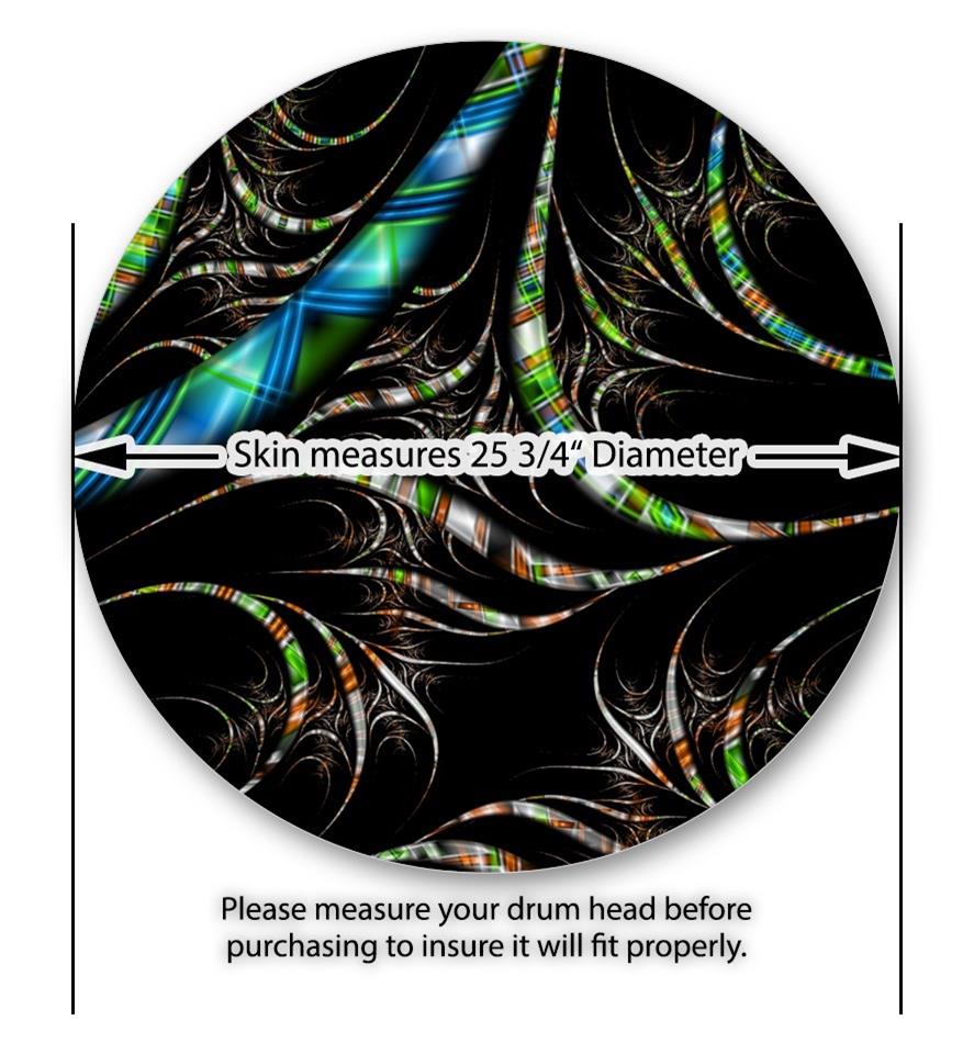 This design also available in other sizes. WraptorSkinz® skin wraps compatible with most kick drum heads. Printed using superb photo quality designs and vibrant colors printed with special fade resistant inks that last even in direct sun for years. WraptorSkinz are a composite three layer commercial grade materials vinyl. The bottom layer is a air release, grey block out removable adhesive that hides existing graphics on the drum head and is easily applied without air bubbles. The middle layer is a flexible vinyl printed with UV protected, fade resistant inks that deliver superb photo quality designs in vibrant colors. Finally, we bond a professional grade laminate over the entire skin adding a glossy protective finish.