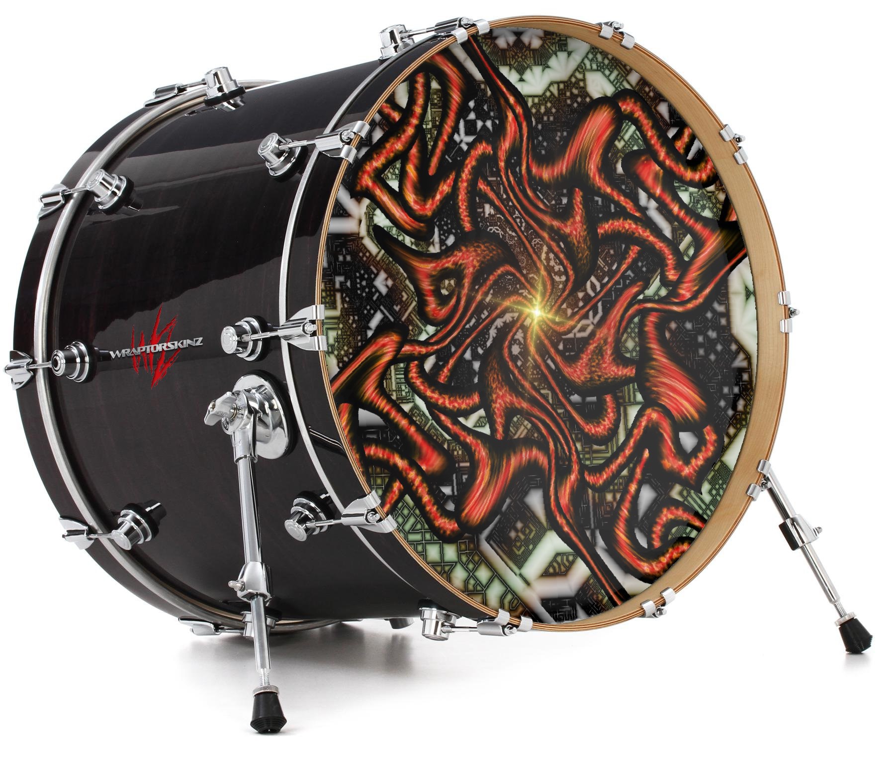 This design also available in other sizes. WraptorSkinz® skin wraps compatible with most kick drum heads. Printed using superb photo quality designs and vibrant colors printed with special fade resistant inks that last even in direct sun for years. WraptorSkinz are a composite three layer commercial grade materials vinyl. The bottom layer is a air release, grey block out removable adhesive that hides existing graphics on the drum head and is easily applied without air bubbles. The middle layer is a flexible vinyl printed with UV protected, fade resistant inks that deliver superb photo quality designs in vibrant colors. Finally, we bond a professional grade laminate over the entire skin adding a glossy protective finish.