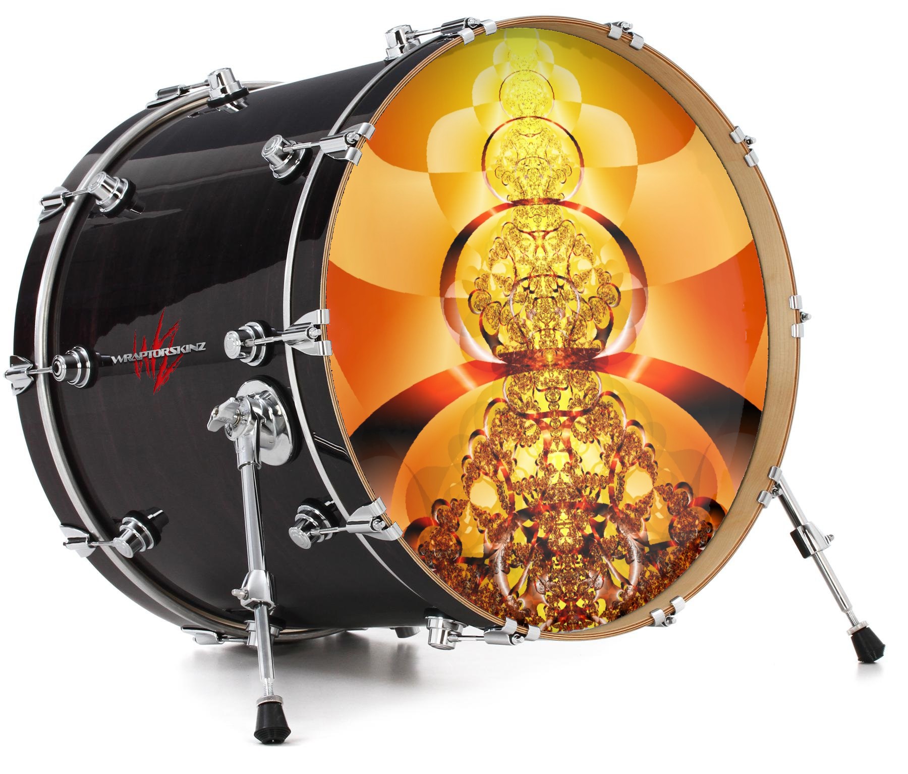 This design also available in other sizes. WraptorSkinz® skin wraps compatible with most kick drum heads. Printed using superb photo quality designs and vibrant colors printed with special fade resistant inks that last even in direct sun for years. WraptorSkinz are a composite three layer commercial grade materials vinyl. The bottom layer is a air release, grey block out removable adhesive that hides existing graphics on the drum head and is easily applied without air bubbles. The middle layer is a flexible vinyl printed with UV protected, fade resistant inks that deliver superb photo quality designs in vibrant colors. Finally, we bond a professional grade laminate over the entire skin adding a glossy protective finish.