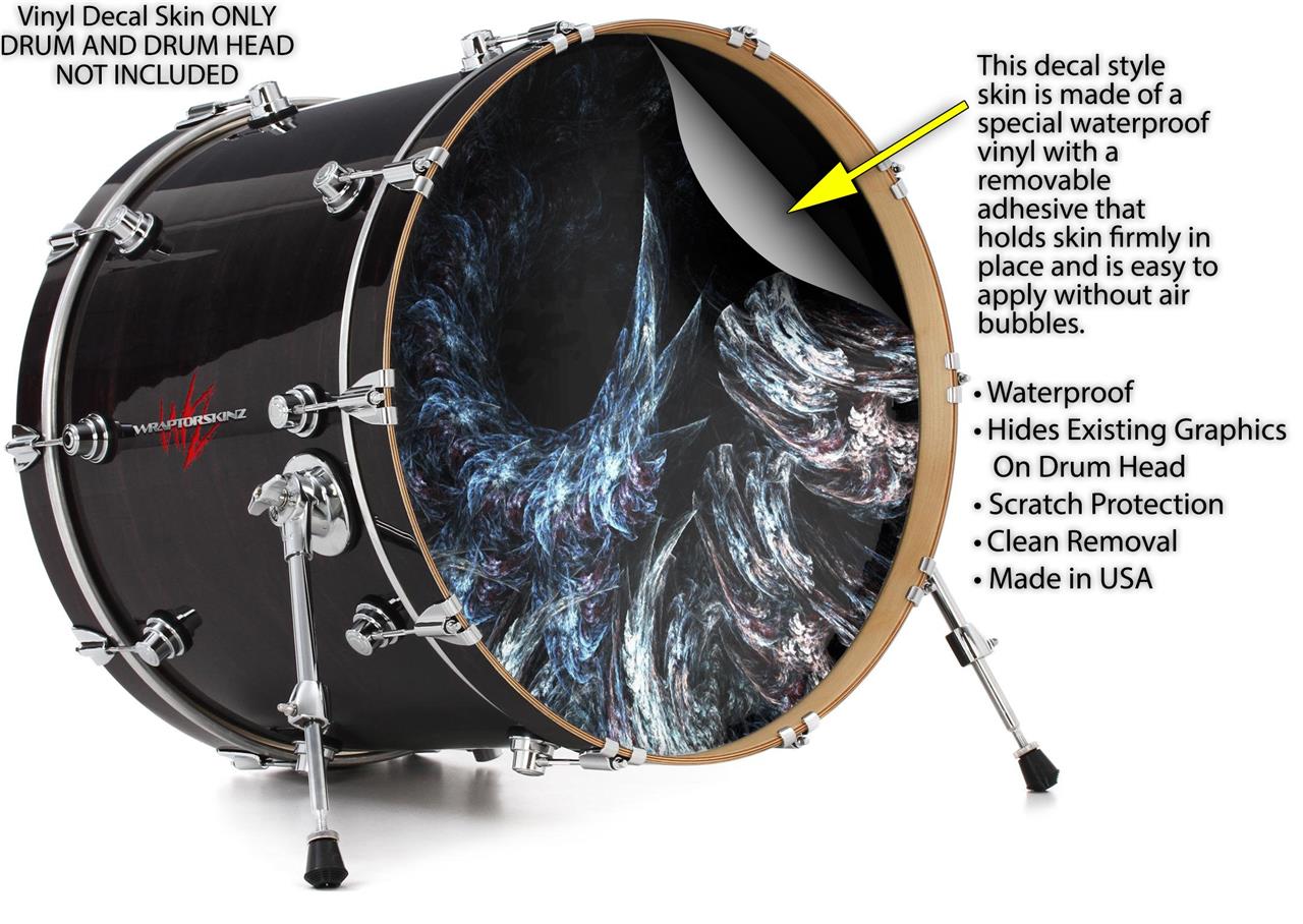 This design also available in other sizes. WraptorSkinz® skin wraps compatible with most kick drum heads. Printed using superb photo quality designs and vibrant colors printed with special fade resistant inks that last even in direct sun for years. WraptorSkinz are a composite three layer commercial grade materials vinyl. The bottom layer is a air release, grey block out removable adhesive that hides existing graphics on the drum head and is easily applied without air bubbles. The middle layer is a flexible vinyl printed with UV protected, fade resistant inks that deliver superb photo quality designs in vibrant colors. Finally, we bond a professional grade laminate over the entire skin adding a glossy protective finish.
