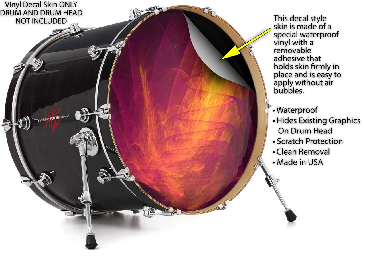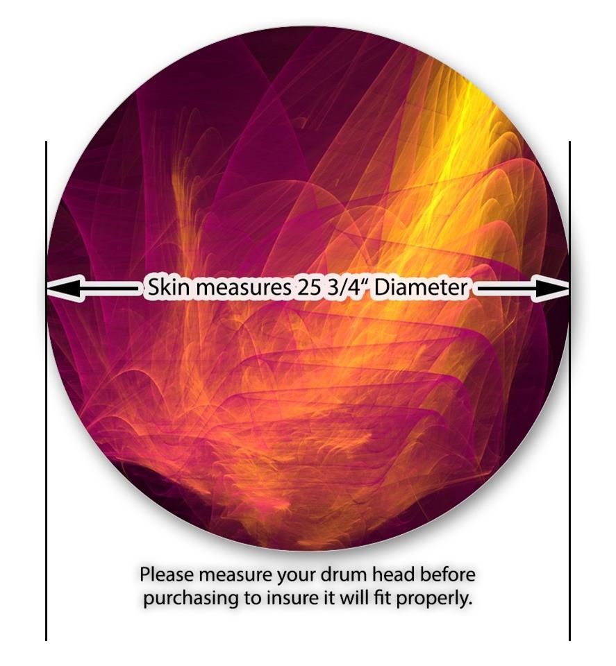 This design also available in other sizes. WraptorSkinz® skin wraps compatible with most kick drum heads. Printed using superb photo quality designs and vibrant colors printed with special fade resistant inks that last even in direct sun for years. WraptorSkinz are a composite three layer commercial grade materials vinyl. The bottom layer is a air release, grey block out removable adhesive that hides existing graphics on the drum head and is easily applied without air bubbles. The middle layer is a flexible vinyl printed with UV protected, fade resistant inks that deliver superb photo quality designs in vibrant colors. Finally, we bond a professional grade laminate over the entire skin adding a glossy protective finish.