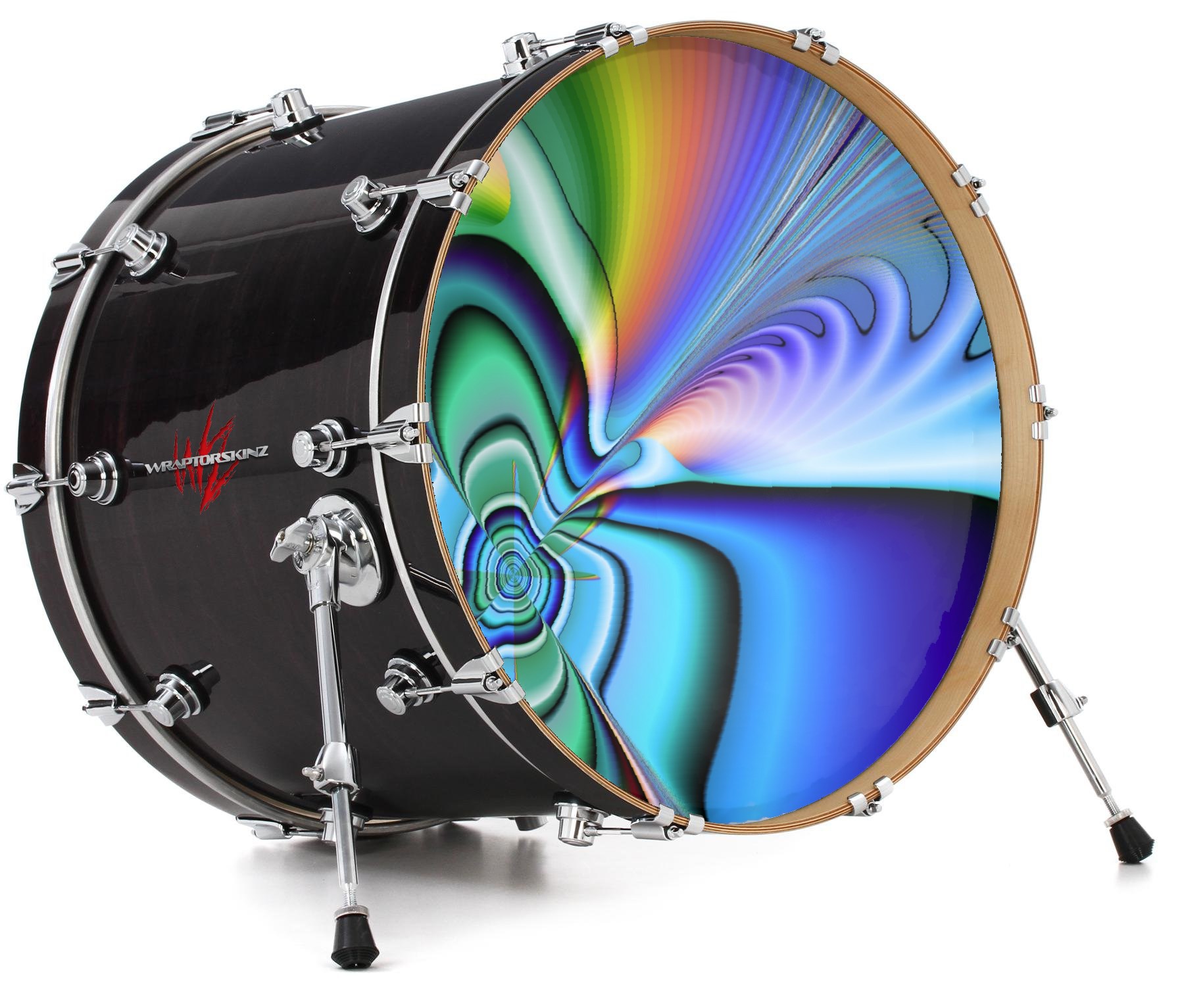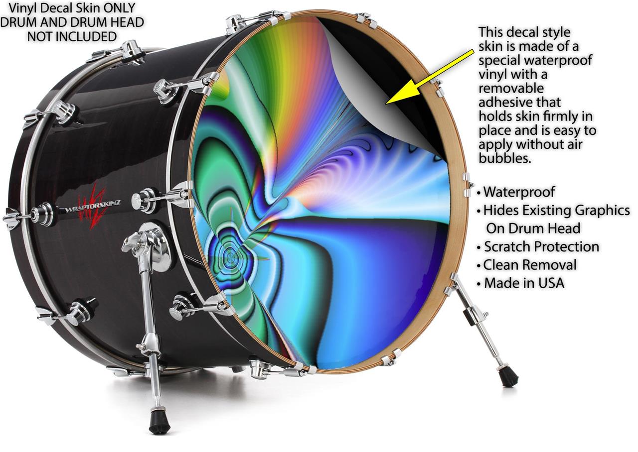 This design also available in other sizes. WraptorSkinz® skin wraps compatible with most kick drum heads. Printed using superb photo quality designs and vibrant colors printed with special fade resistant inks that last even in direct sun for years. WraptorSkinz are a composite three layer commercial grade materials vinyl. The bottom layer is a air release, grey block out removable adhesive that hides existing graphics on the drum head and is easily applied without air bubbles. The middle layer is a flexible vinyl printed with UV protected, fade resistant inks that deliver superb photo quality designs in vibrant colors. Finally, we bond a professional grade laminate over the entire skin adding a glossy protective finish.