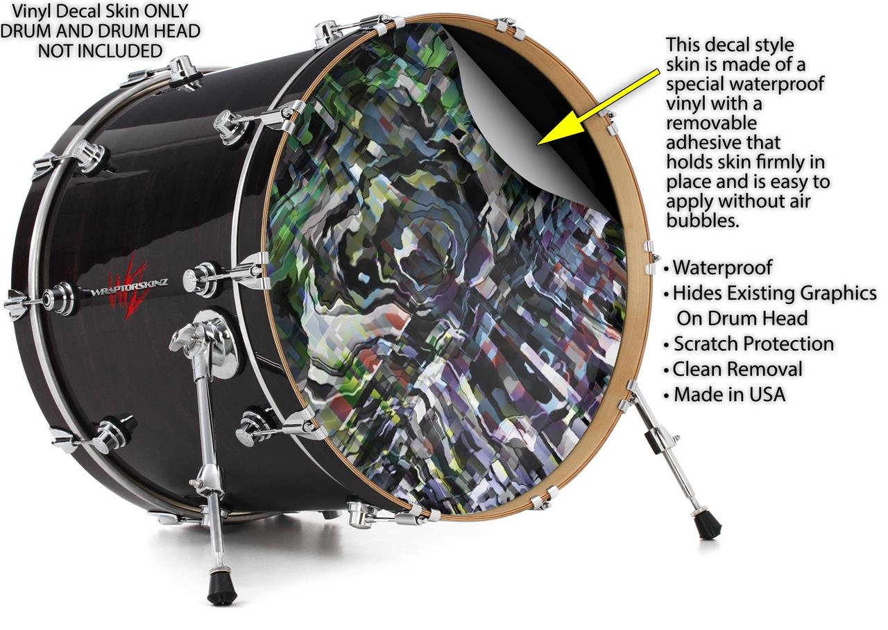 This design also available in other sizes. WraptorSkinz® skin wraps compatible with most kick drum heads. Printed using superb photo quality designs and vibrant colors printed with special fade resistant inks that last even in direct sun for years. WraptorSkinz are a composite three layer commercial grade materials vinyl. The bottom layer is a air release, grey block out removable adhesive that hides existing graphics on the drum head and is easily applied without air bubbles. The middle layer is a flexible vinyl printed with UV protected, fade resistant inks that deliver superb photo quality designs in vibrant colors. Finally, we bond a professional grade laminate over the entire skin adding a glossy protective finish.