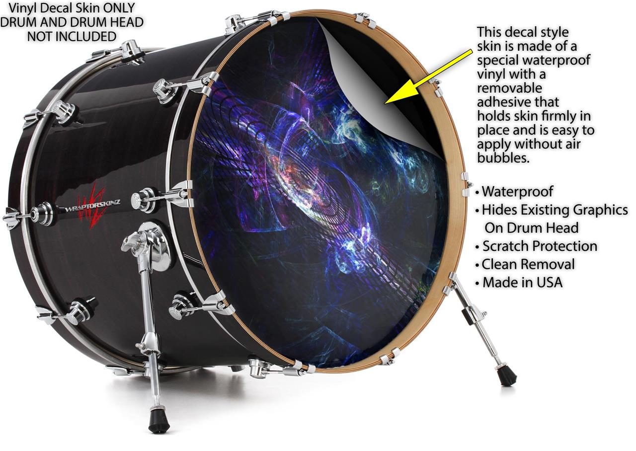 This design also available in other sizes. WraptorSkinz® skin wraps compatible with most kick drum heads. Printed using superb photo quality designs and vibrant colors printed with special fade resistant inks that last even in direct sun for years. WraptorSkinz are a composite three layer commercial grade materials vinyl. The bottom layer is a air release, grey block out removable adhesive that hides existing graphics on the drum head and is easily applied without air bubbles. The middle layer is a flexible vinyl printed with UV protected, fade resistant inks that deliver superb photo quality designs in vibrant colors. Finally, we bond a professional grade laminate over the entire skin adding a glossy protective finish.