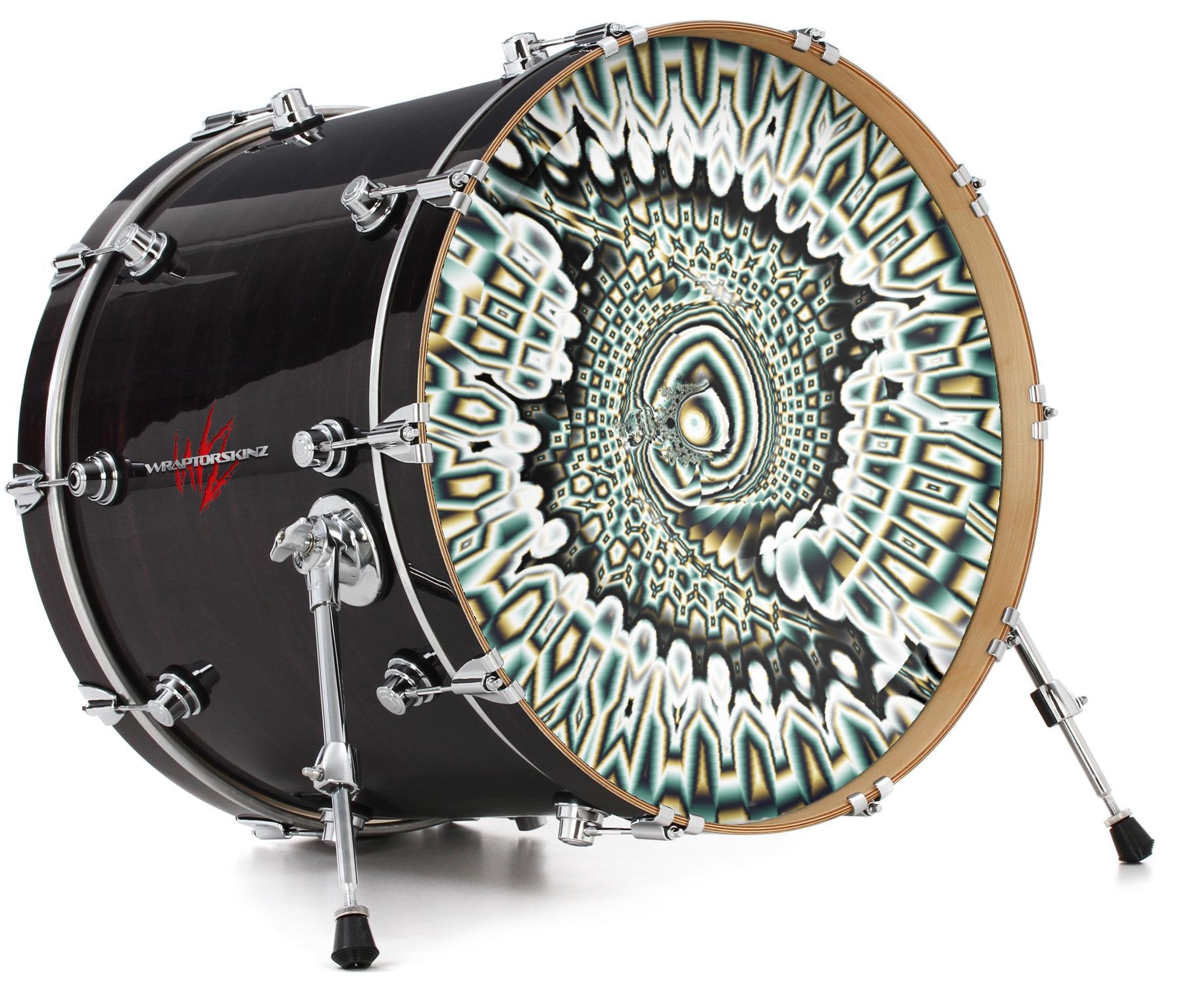 This design also available in other sizes. WraptorSkinz® skin wraps compatible with most kick drum heads. Printed using superb photo quality designs and vibrant colors printed with special fade resistant inks that last even in direct sun for years. WraptorSkinz are a composite three layer commercial grade materials vinyl. The bottom layer is a air release, grey block out removable adhesive that hides existing graphics on the drum head and is easily applied without air bubbles. The middle layer is a flexible vinyl printed with UV protected, fade resistant inks that deliver superb photo quality designs in vibrant colors. Finally, we bond a professional grade laminate over the entire skin adding a glossy protective finish.