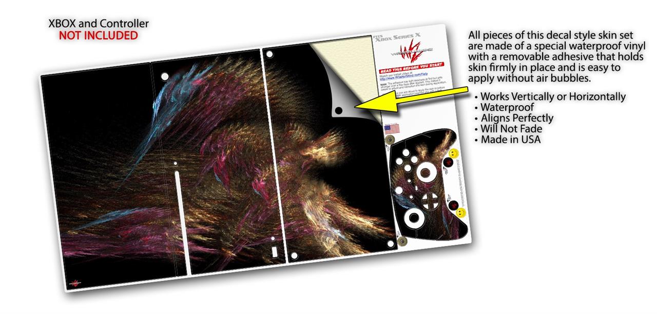 WraptorSkinz® skin wraps for the XBOX Series X gaming console and controller reelase November 2020 are printed using superb photo quality designs and vibrant colors printed with special fade resistant inks that last even in direct sun for years. WraptorSkinz are a composite of two layers of commercial grade materials. The bottom layer is a soft, flexible vinyl with a special removable adhesive that is easily positioned, applied without air bubbles. Next we print the bottom layer with UV protected, fade resistant inks that deliver superb photo quality designs in vibrant colors. Last, we bond a professional grade laminate over the entire skin adding a glossy protective finish. This product is not affiliated with or endorsed by Microsoft or the XBOX brand.