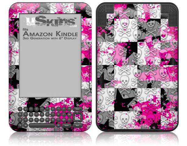 Checker Skull Splatter Pink - Decal Style Skin fits Amazon Kindle 3 Keyboard (with 6 inch display)