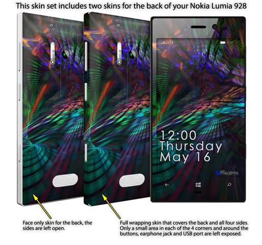 • Decal style vinyl skin covers front, back and side of Nokia Lumia 928 phone.
