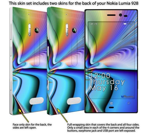 • Decal style vinyl skin covers front, back and side of Nokia Lumia 928 phone.