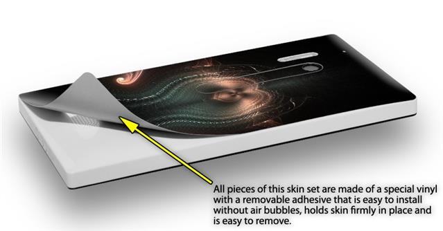 • Decal style vinyl skin covers front, back and side of Nokia Lumia 928 phone.