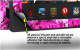 uSkins™ are self adhering vinyl skins that help prevent scratches and look great doing it. Unlike bulky silicon and plastic covers, uSkins are designed to be thin and very tough. uSkins are a composite of two layers of commercial grade materials. The bottom layer is a soft, flexible vinyl with a special removable adhesive that is easily positioned and applied without air bubbles. The bottom layer print with special UV protected, fade resistant inks that deliver superb photo quality designs in vibrant colors. Finally we bond a professional grade laminate over the entire skin adding a glossy protective finish.