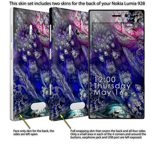 • Decal style vinyl skin covers front, back and side of Nokia Lumia 928 phone.